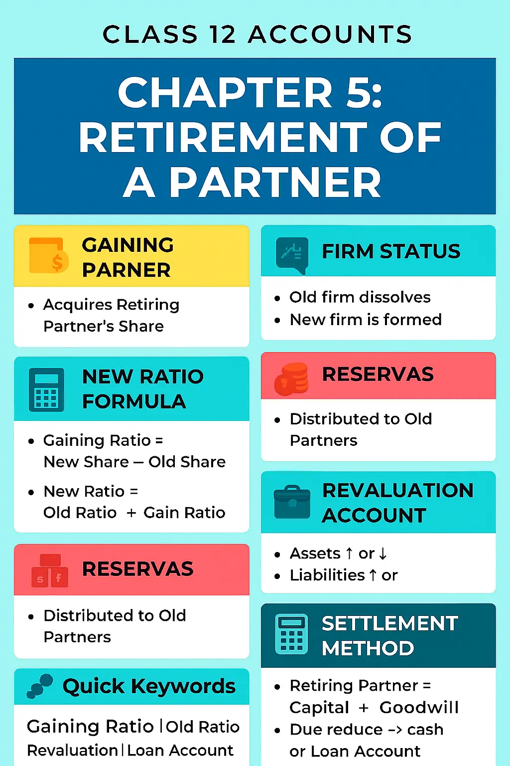 - Settlement of Retiring Partner → Cash, loan account, ya installments me.