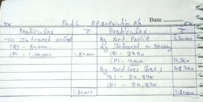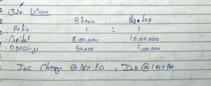 Question 20. Bhanu and Partap are partners sharing profits equally. Their fixed capitals as on 1st April, 2023 were ₹ 8,00,000 and ₹ 10,00,000 respectively. Their drawings during the year were ₹ 50,000 and ₹ 1,00,000 respectively. Interest on Capital is a charge and is to be allowed @ 10% p.a. and interest on drawings is to be charged @ 15% p.a. Net Profit for the year ended 31st March, 2024 before giving effect to the above) was ₹ 1,20,000.