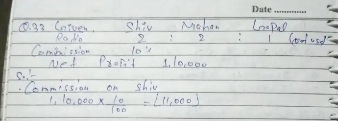 33. Shiv, Mohan and Gopal are partners sharing profits in the ratio of 3 : 2 : 1. Shiv is entitled to a commission of 10% on profit. Net profit for the year ended 31st March, 2024 is ₹ 3,30,000.