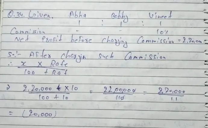 34. Abha, Bobby and Vineet are partners sharing profits in the ratio of 3 : 2 : 1. Vineet is entitled to commission of 10% on the net profit after charging such commission. If the amount of commission is ₹ 2,20,000.