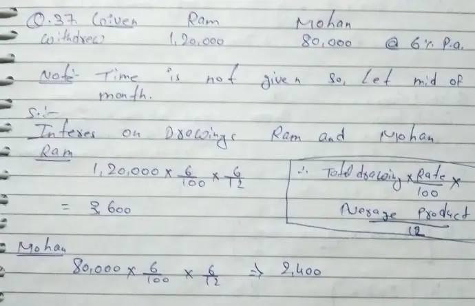 37. Ram and Mohan, two partners, drew for their personal use ₹ 1,20,000 and ₹ 80,000. Interest is chargeable @ 6% p.a. on the drawings. What is the amount of interest chargeable from each partner?