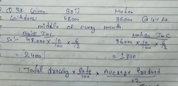 38. Brij and Mohan are partners in a firm. They withdrew ₹ 48,000 and ₹ 36,000 respectively during the year evenly in the middle of every month. According to the Partnership Deed, interest on drawings is to be charged @ 10% p.a.