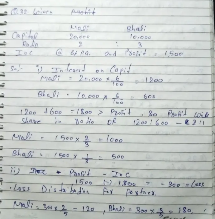 32. Moli and Bholi contribute ₹ 20,000 and ₹ 10,000 respectively towards capital. They decide to allow interest on capital @ 6% p.a. Their respective share of profits is 2 : 3 and profit for the year is ₹ 1,500. Show distribution of profits: