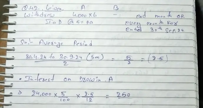 A and B are partners sharing profits equally. A drew regularly ₹ 4,000 at the end of every month for six months ended 30th September, 2023. Calculate interest on drawings @ 5% p.a. for a period of six months ended 30th September, 2023.